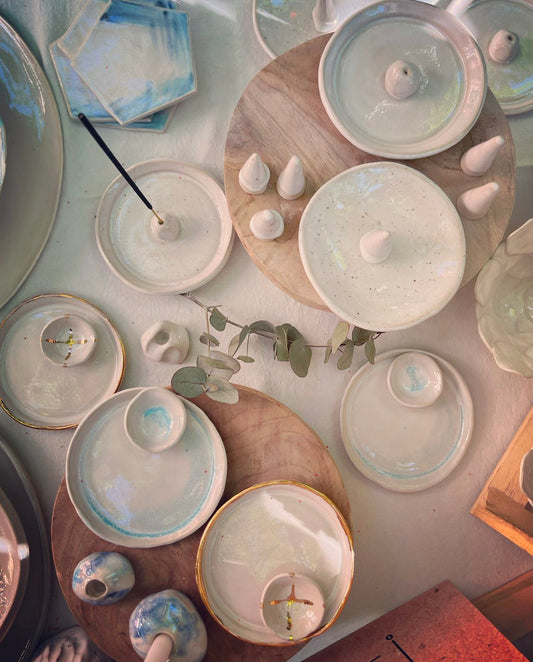 I allow the pottery to dry slowly to ensure it is ready for the first bisque firing. The glaze is then applied using a brush on technique before the pieces undergo a second firing. Finally, all items are carefully sanded and cleaned to achieve a smooth finish.
